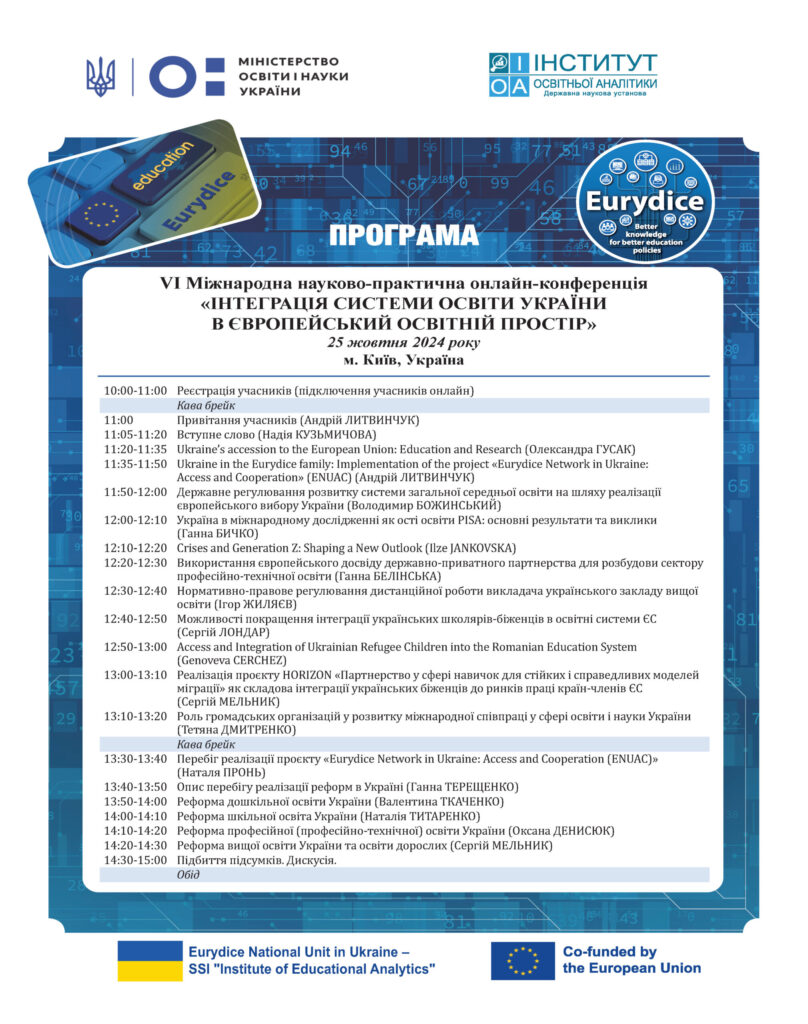 25 жовтня 2024 р. відбулася VI Міжнародна науково-практична конференція на тему «Інтеграція системи освіти України в європейський освітній простір». Захід проходив у рамках проєкту європейської освітньої мережі «Евридіка» «Eurydice Network in Ukraine: Access and Cooperation» (ENUAC) за підтримки Єврокомісії на базі національного підрозділу «Евридіки» в Україні – ДНУ «Інститут освітньої аналітики».